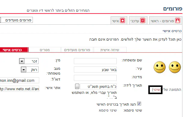 נכנסת לפורומים [הדף הראשי]>>>עריכת כרטיס אישי>>ולוחצת "שנוי"