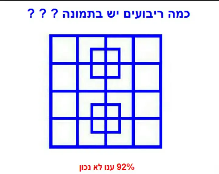 ריבועים קטנים ביותר יש 8. ריבועים קצת יותר גדולים 16. ריבועים המורכבים מ-4 ריבועים יש 9. ריבועים המורכבים מ-9 ריבועים יש 4. 2 ריבועים קטנים באמצע שמורכבים מ-4. ריבוע אחד גדול המכיל את כולם סה"כ 40 ריבועים.