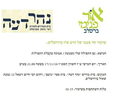 20:30 שיעור של הרב מאורו פירר- "אעירה שחר"- ביאור פנימי על תפילת שחרית, על פי תורה רפ"ב. מומלץ!!!