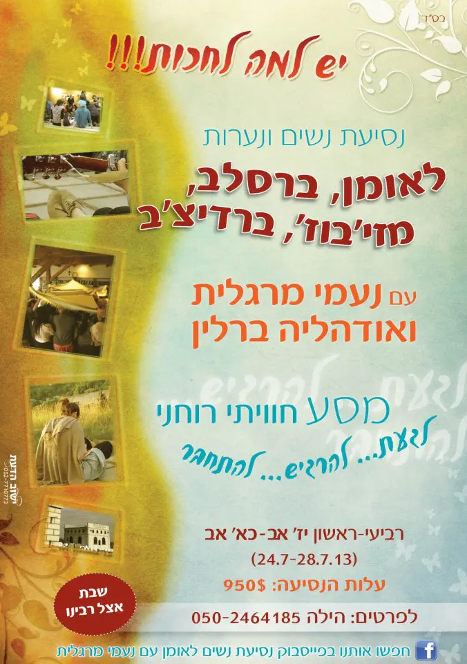 שמעתי שהולכת להיות בחודש אב טיסה עם הרבנית נעמי מרגלית (אמרו לי עליה דברים ממש טובים!) ואודליה ברלין...