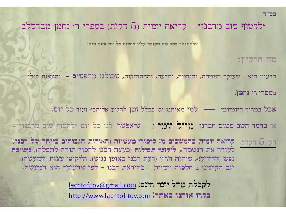 רבינו ז"ל גילה לנו, שהשמחה מרחבת את דעת האדם, השמחה מקשרת את האדם אליו יתברך, השמחה פותחת את הלב, על כן ראה להיות תמיד בשמחה ולנגן בכלי זמר, וראה לשמח את עצמך, את אשתך ואת ילדיך, ואת כל חבריך.