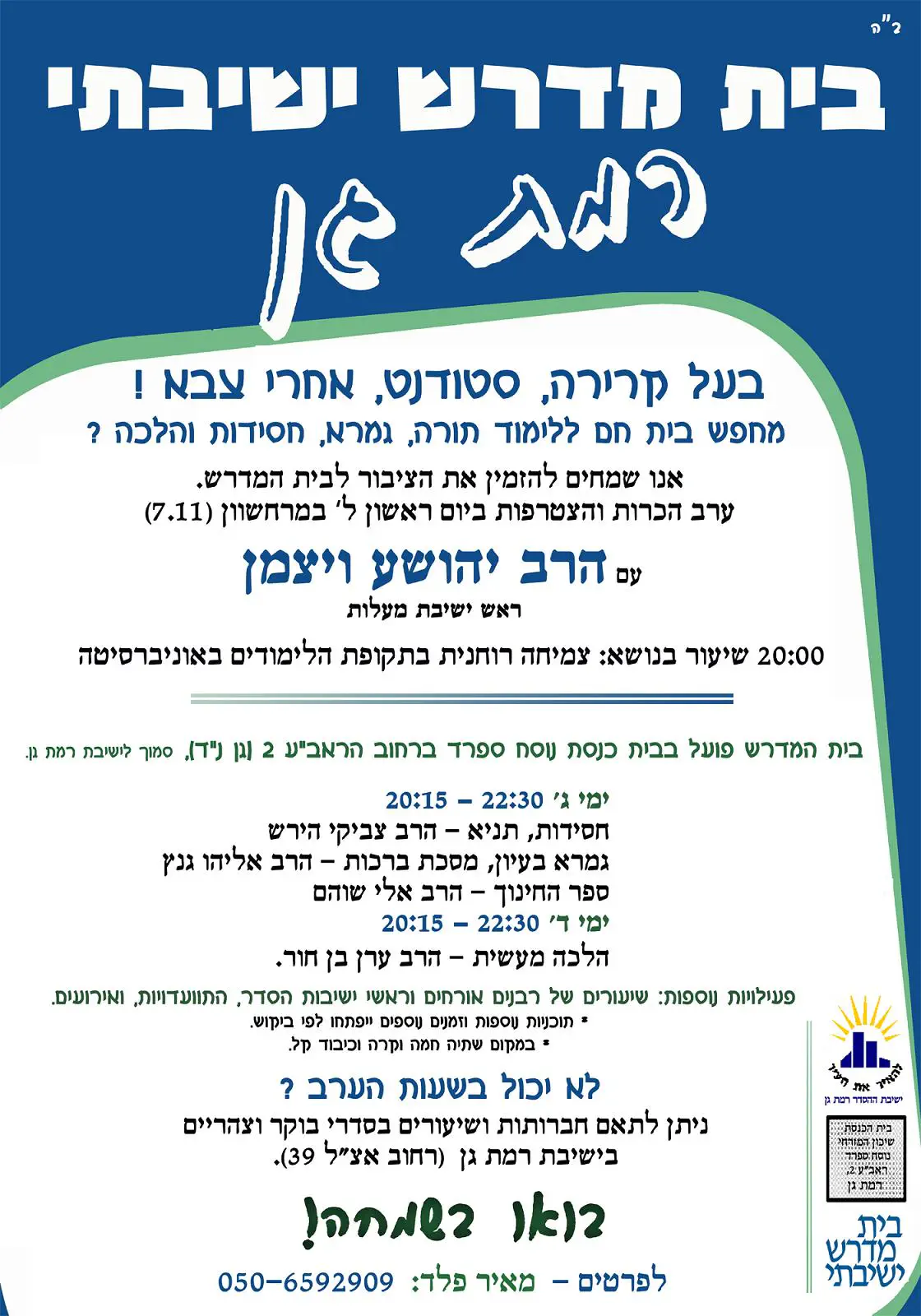 הזמנה:פתיחת בית מדרש לסטודנטים ברמת גן ליד בר אילןאנונימי (פותח)