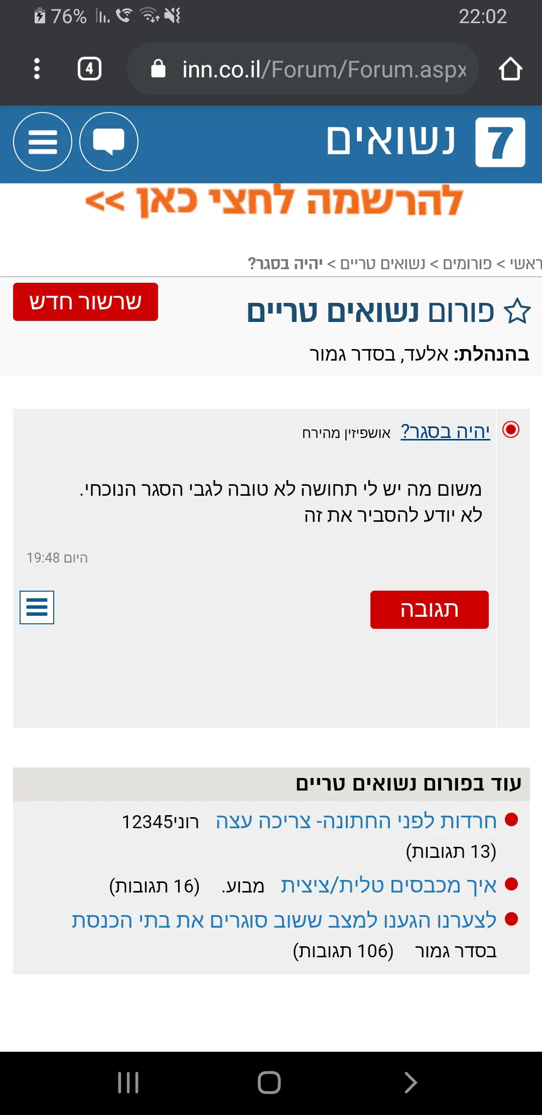 ומה שהכי מעצבן אותי שבזמן שאנחנו מותרים כול פעם אני זה שיוזם וזה שרוצה... ושהיא אסורה היא גולשת לאתרי זימה... קצת מיואש אשמח לעזרה והבנה תודה