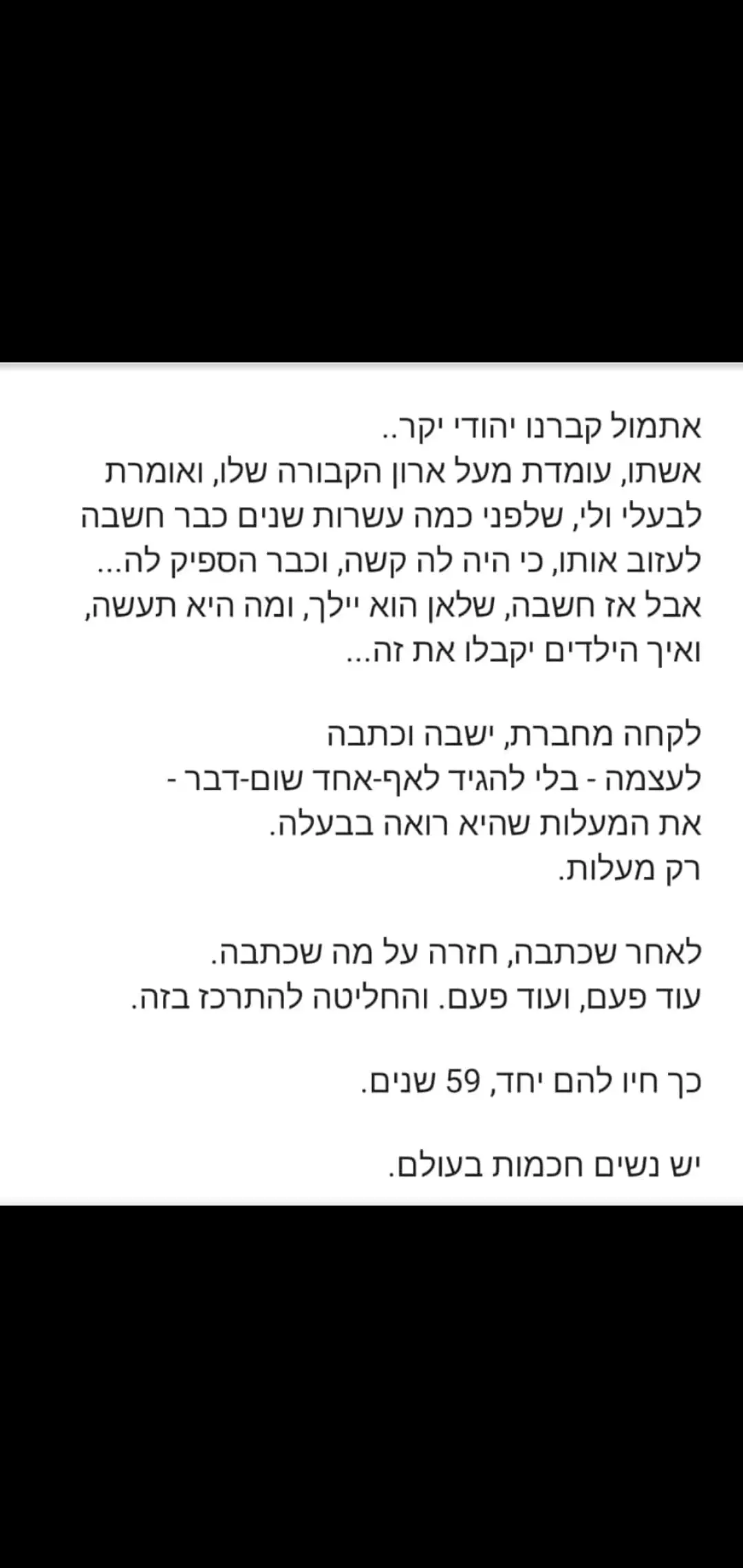 אני לא מפחדת שלא אמצא מישהו אחר להקים איתו בית, אני כ''כ רוצה בבית, אני אוהבת להיות רעיה, אמא וחברה. אני מרגישה שזה הייעוד שלי. אני פשוט מפחדת שאולי אני צריכה לתת לו עוד הזדמנות ולהאמין באדם ובתשובה. נראה שהוא באמת מתכוון לתת את הכל.
