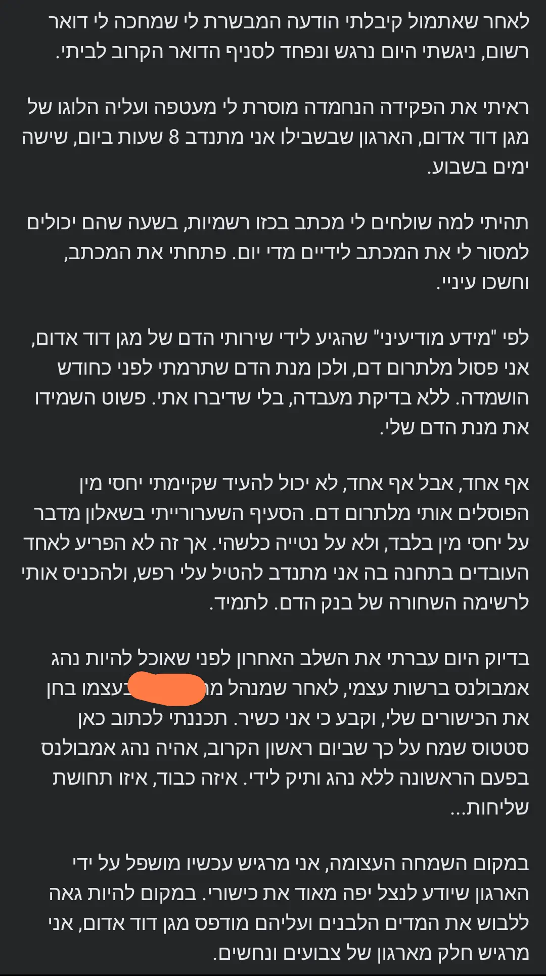 מאז השאלה המשפילה, המפלה והלא רלוונטית כבר הוסרה מהשאלון של מד''א, אך בכל זאת לא הלכתי אליהם לתרום דם (תרמתי דרך בית חולים). הפחד מכך שלא יאפשרו לי, העלבון מכך שמנת דם שלי הושמדה, הכל כל כך טרי...