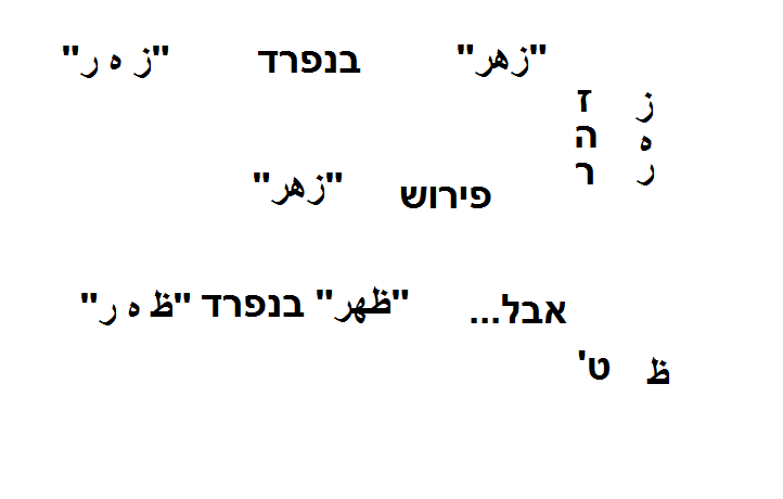 ظ זה אות שאין לה מקבילה בעברית וכותבים אותה " ט' ". ביטויה כ ז' "כבדה", כשהלשון צמוד לחיך. פירוש "ظهر" זה "גב". ולכן "זהרת א-דבבה" או "ט'הרת א-דבבה" זה "גב הדובים".