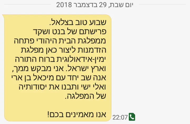 יש לנו את האפשרות להקים מפלגה אחת שתרים בו זמנית את שני הדגלים הכי חשובים לנו. גם את התורה וגם את ארץ ישראל. ובשביל שזה יקרה, אנחנו צריכים גם את אלי ישי, ואת הניסיון הרב שיש לו.