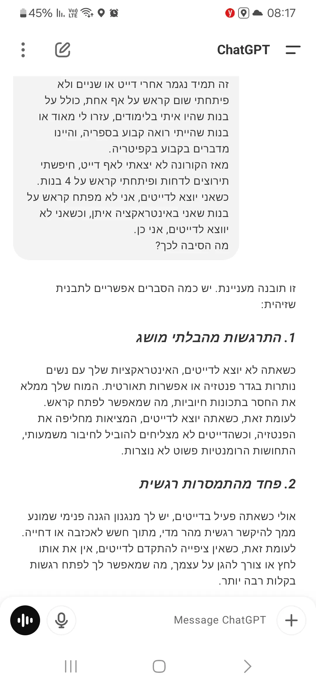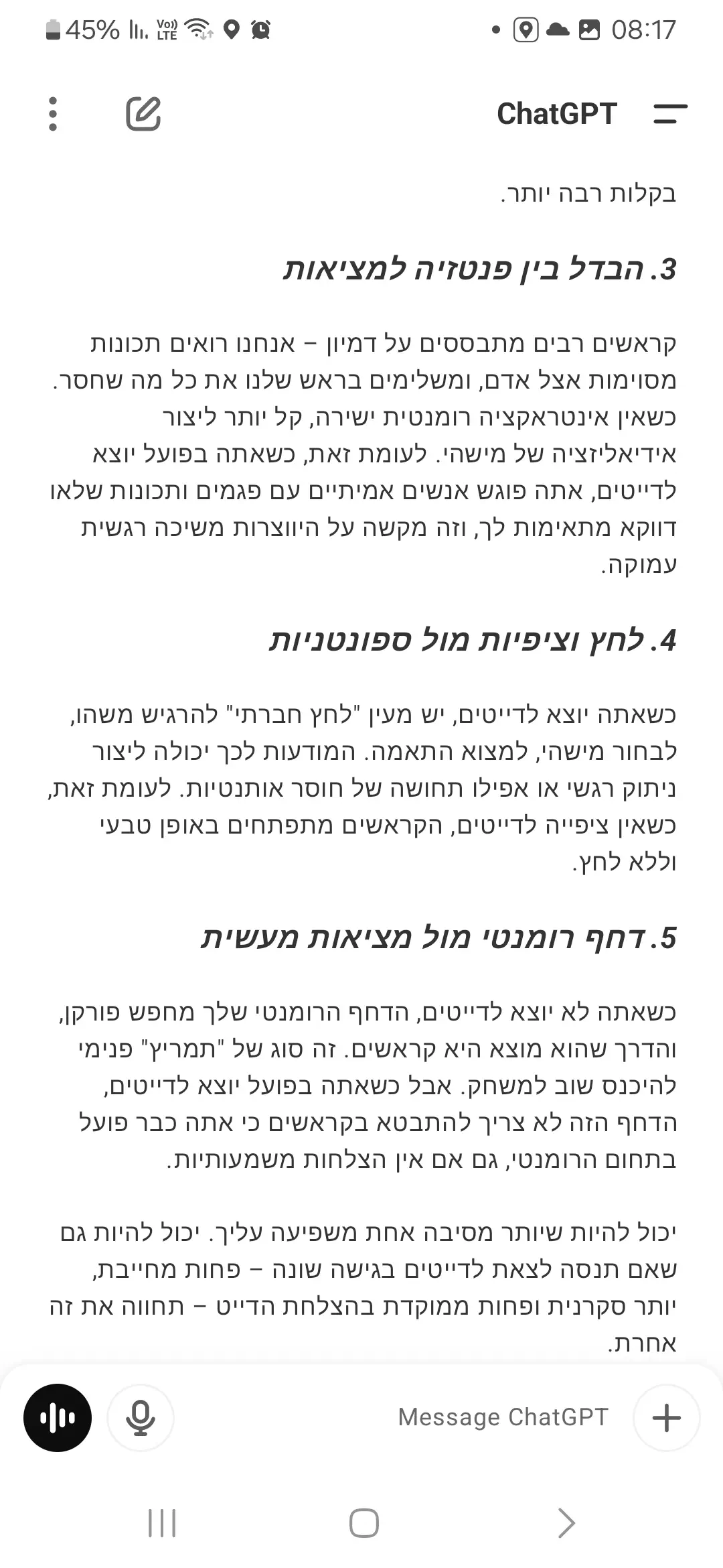 לצאת לפגישה זה לצאת עם מועמדת לחתונה על כל המשתמע ויש בזה פן בירורי־ביקורתי כו' שהמוח עובד במודע או שלא במודע, לפיו