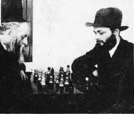 [בתמונה: ליל ניטל: הרבי מליובאביטש במשחק שחמט עם חמיו האדמור יוסף יצחק זצוק"ל]
