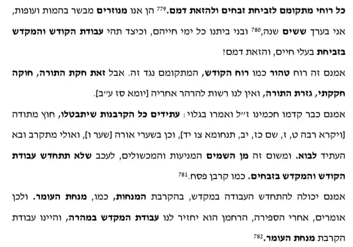 כיום כשאין השראת שכינה ונבואה, הממימד הרוחני נבדל מהגשמי (כמו אדם מת שנשמתו נבדלת מגופו) ואנחנו לא מצליחים להבין בכלל את עניין הקרבנות רגשית, עד שכל עניין חיות הרוחני בגשמי הפך לסוד מסודות תורה ולכן הרמבן בגלות אומר שהקרבנות זה סוד עמוק. כאשר בימי התנך זה לא היה סוד אלא פשוט לכל אדם. לעתיד לבוא כשתחזור הנבואה והשכינה אז נזדהה רגשית עם הקרבנות שוב.