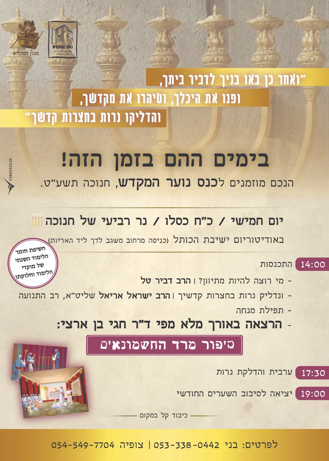 יום חמישי ז' כסלו תשע"ט, באודיטוריום של מכון המקדש ברובע היהודי רח' משגב לדך 40