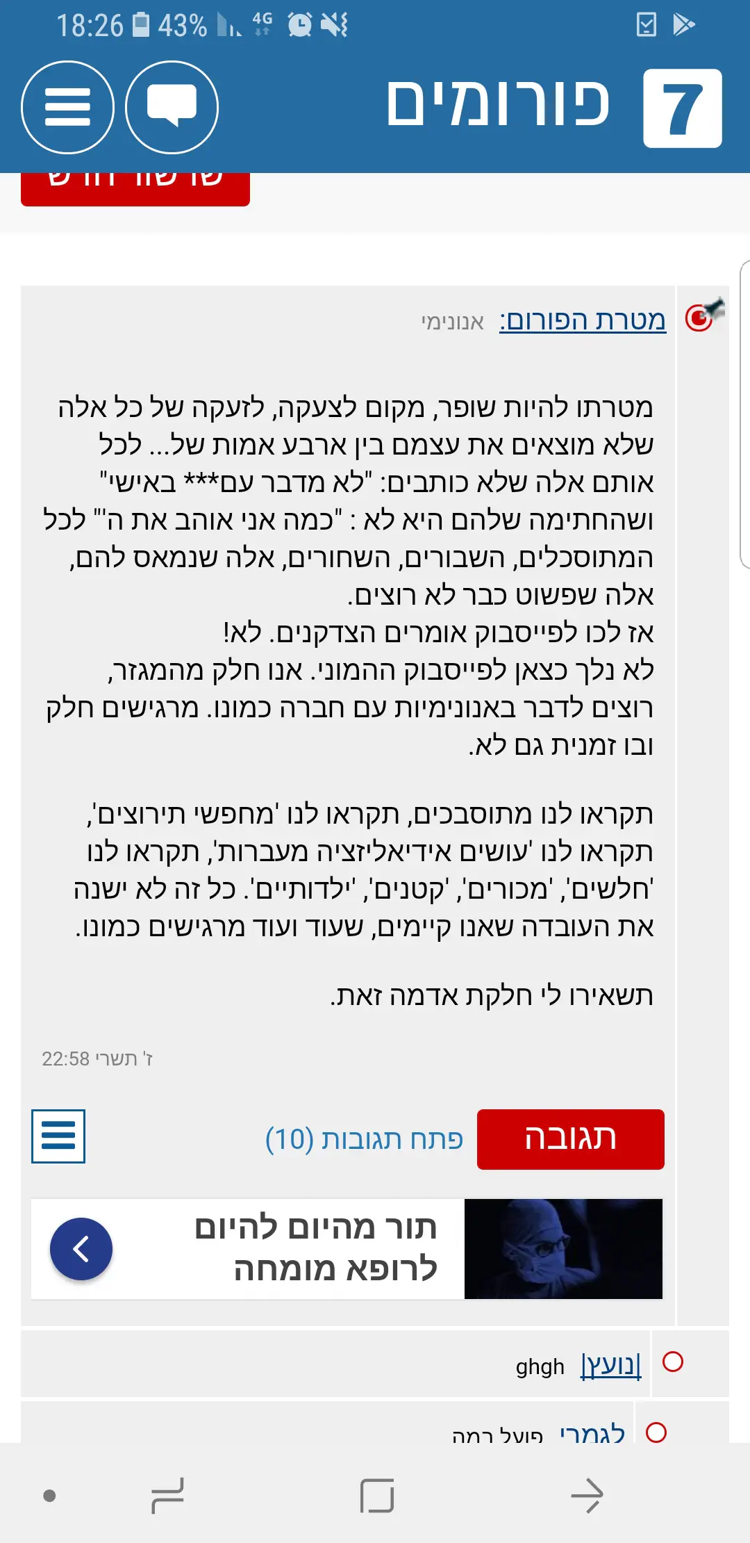 הפורום לא נועד לפגוע באנשים אחרים, מי שרוצה יכול לעשות זאת בפרטי