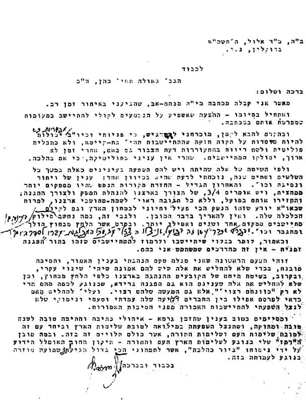 כאשר הרבי דחף ליצירת חזית דתית שבה ישולבו כל המפלגות הדתיות- חרדיות, לאומיות, כולם- הרבי הסביר שזה יחזק את שלמות התורה בארץ ולכן ביקש שכל מפלגה תכתוב ותודיע אם היא בעד או נגד כדי שיוכלו לבדוק ולקחת את זה כשיקול בהצבעה (שוב, הרבי נותן לנו שיקול לשילוב במערכת השיקולים אבל לא בוחר לנו מפלגה).