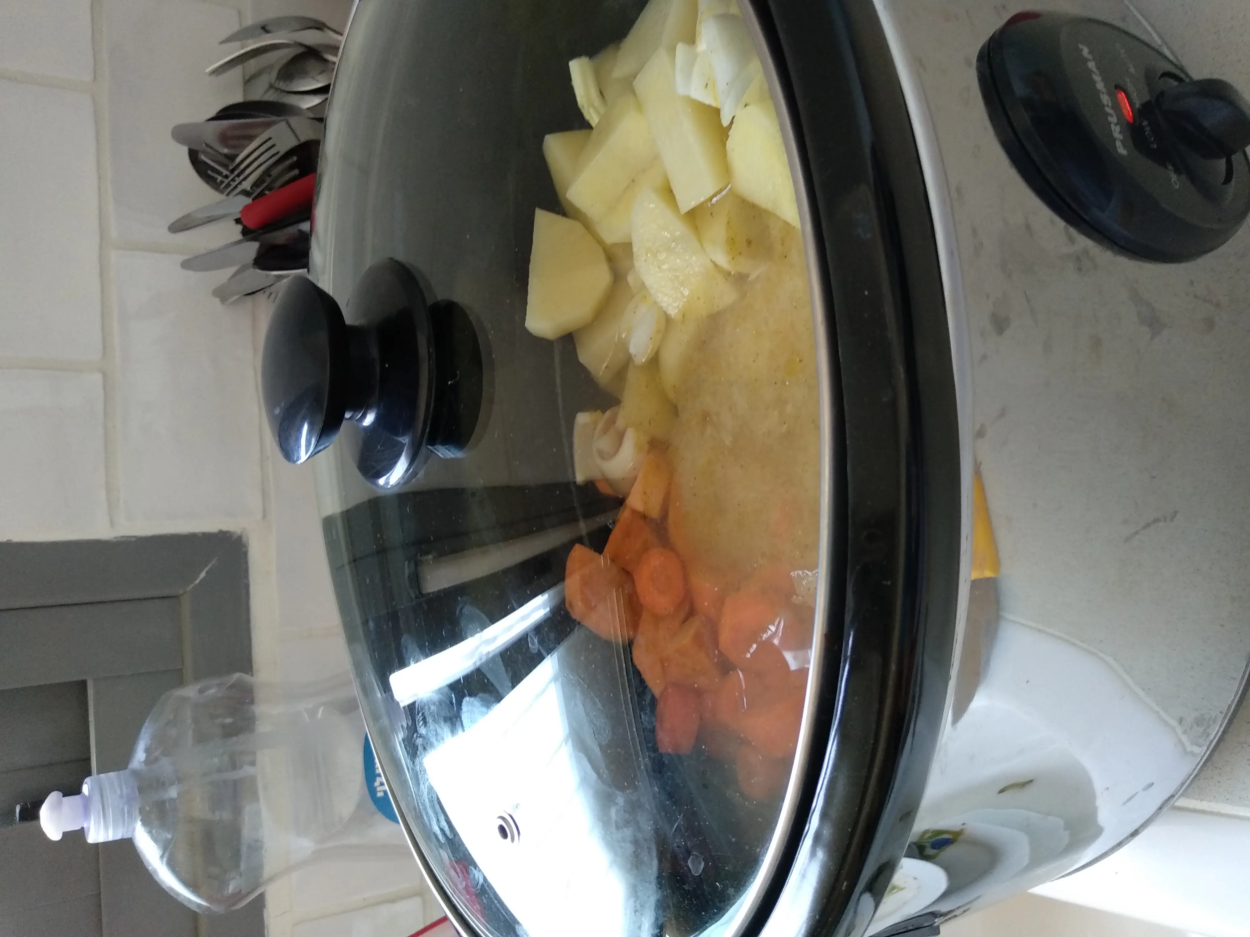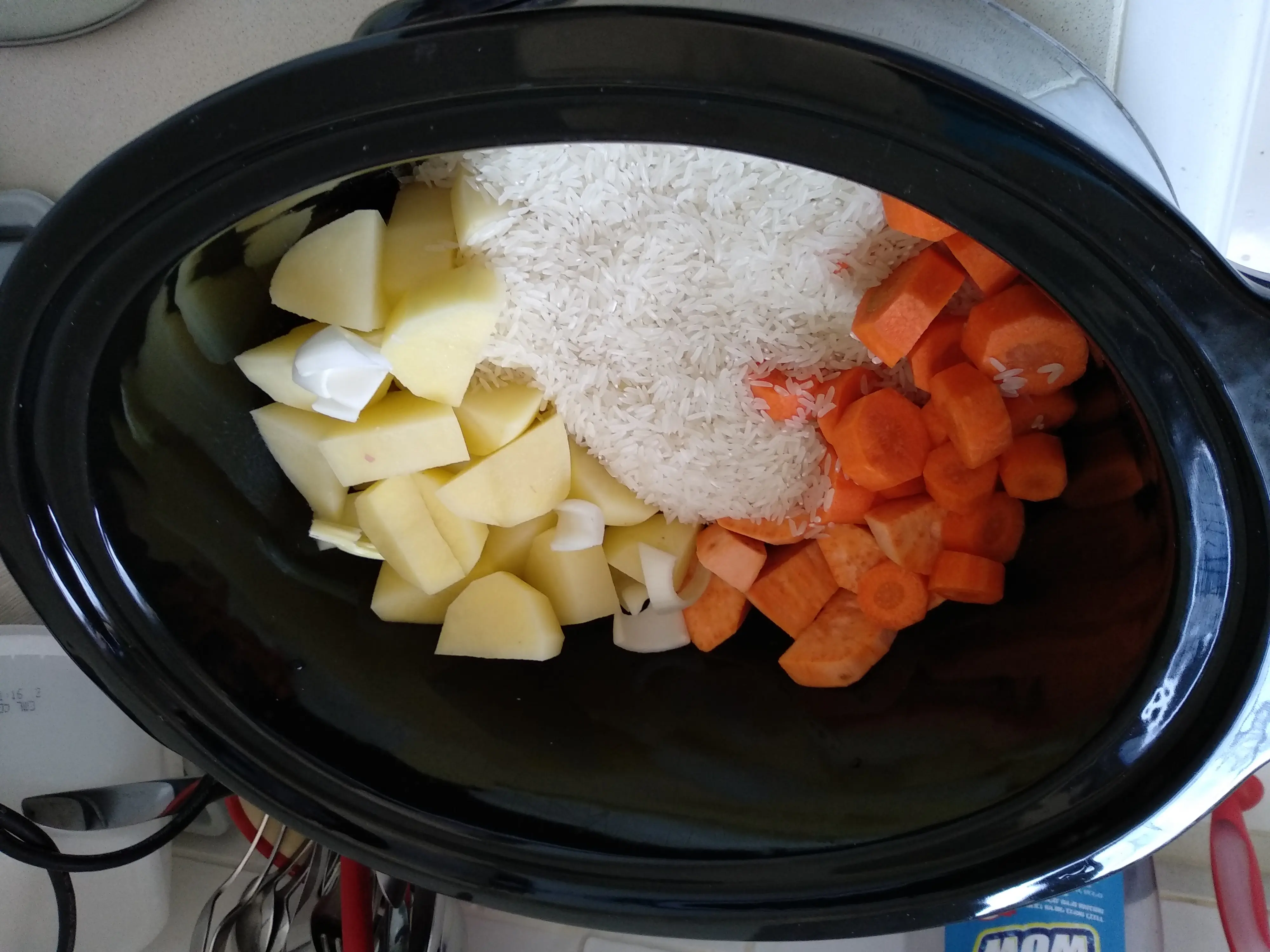 נכין נראלי עוף פיקנטי עם בטטה ובצל. אורז, אפונה.