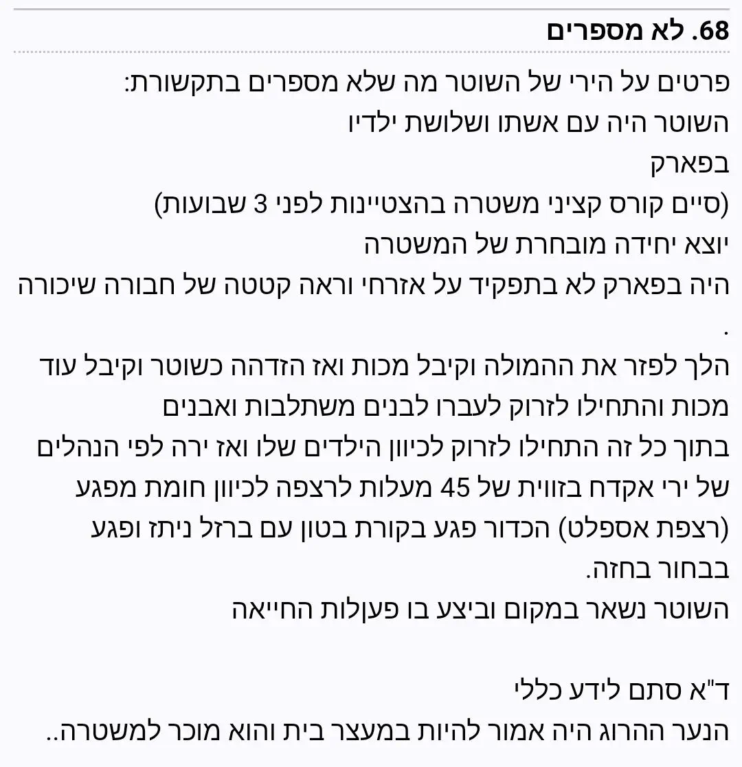 ואם אכן היה עם ילדיו, ועבריינים זרקו לעברם אבנים ולבנים - מה שיכול להיות סכנת חיים, וירה ירי אזהרה, אז אין מה להלין עליו, גם אם קרתה תקלה מצערת מאד בתוצאה.