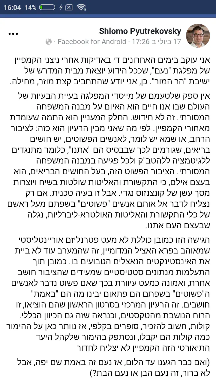 כנראה הוא לא יודע מהו פטרנליזם. כל מי שפוקח עיניים רואה שפטרנליזם מתבטא בתנועת הלהט"ב ודומיהם. אנשי הקו לא מתנשאים על ה"ציבור הרחב" ולא משתמשים בו. הם באמת חושבים שהעם איתם (אם כי לדעתי, כאשר יש פטרלניזם קיצוני מהתקשורת האולטרא-ליברלית, יש צד שאנחנו צריכים להחריף את המאבק ולנהוג כמותם בפטרנליזם. אבל זה לא הדיון). ולדעתי - באמת חלק גדול מהעם איתם. אולי לא לגמרי ואולי לא מתנגד לפונדקאות. אבל רובם המכריע לא רוצה שעמותות כמו חוש"ן ישטפו לילד שלו את המח בגיל 10.