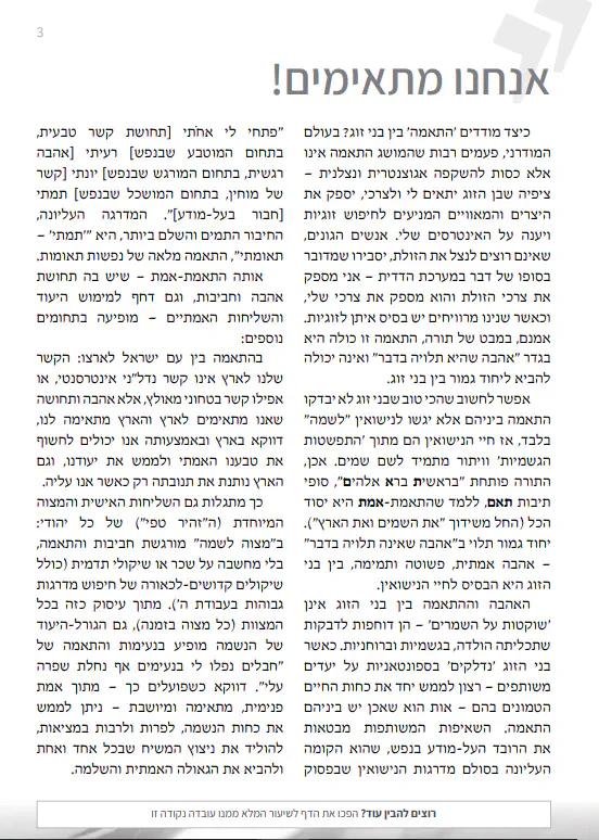.ב'. דבר שני, וזה דבר שהעליתי כבר מההתחלה- אני רוצה להתחתן בע''ה בשנים הקרובות. וכל מה שהוא אומר הוא טוב ויפה, בעולם אוטופי. אבל כיום, כל מה שמלמדים בישיבות ובמדרשות, בציבור התורני- שלא תגידו בציבור הלייטי- זה שחשוב התאמה. וחשוב כימיה. וחשוב קשר. כמובן שהבסיס הוא מידות, ודברים מהותיים