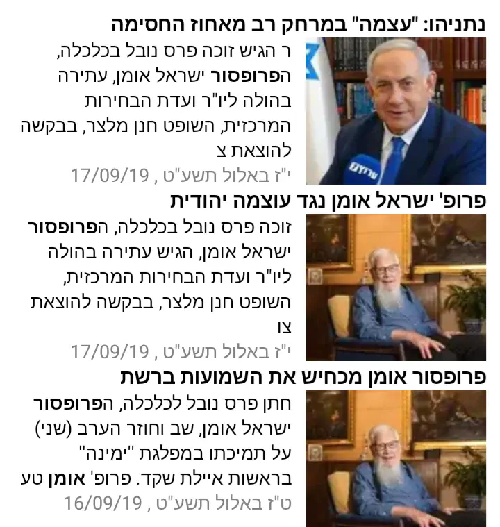 לגבי פרופסור אומן, כמה טוב שאפשר לבדוק את זה בעזרת חיפוש פשוט במערכת החיפוש של הערוץ. שתי אייטמים במושא ועוד פולאפ בכתבה של נתניהו נגד עוצמה יהודית. שום איזכור להחלטה של השופט מלצר -