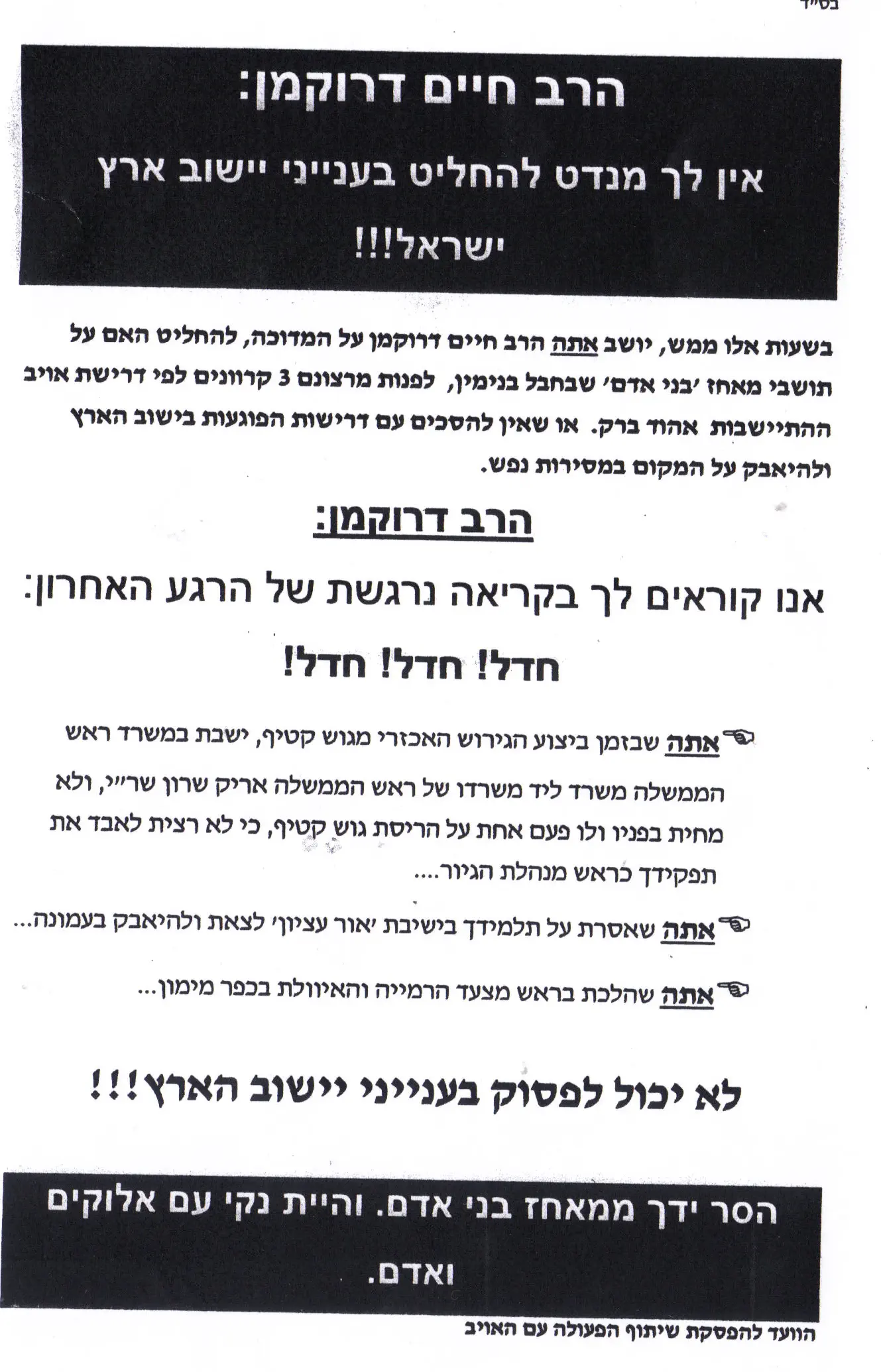 לא רשום בו שהרב דרוקמן לא רב,רק רשום בו שהוא לא שייך לפסוק בעניינים שקשורים לא"י,כי כנראה שהוא פחות מקושר לעניין ורואים את זה מזה שהוא לא נתן לתלמידים שלו לצאת לעמונה,לא נלחם בגוש קטיף,ושהוא הלך עם כולם בשקר בכפר מימון,זה נשמע לי לגיטימי ביותר..