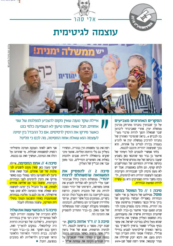 כך או כך, הציונות הדתית יכולה לקום מעפר אם תציג רשימה לכנסת לפי מפתח שלום בית. הרב רפי ראשון, בצלאל שני, ואיתמר שלישי למרות שלפי כל מבחן אלקטורלי הוא צריך להיות ראשון, ובצלאל צריך ללכת הביתה. לשלישיה השניה אני מציע את יוגב, סטרוק, ואדווה. שתי נשים בששת המקומות הראשונים. עם עבודה טובה ובלי ירי בנגמ"ש כולם יהיו מקומות ריאליים.