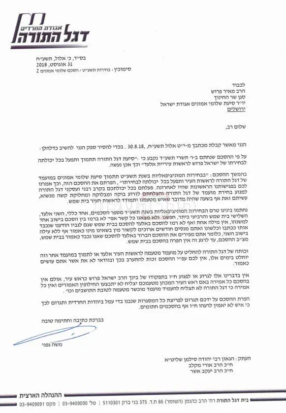 את מכתבו פותח גפני וכותב: "על פי ההסכם שנחתם ב-ו' תשרי תשע"ד נקבע כי 'סיעת דגל התורה תתמוך ותפעל בכל יכולתה לבחירתו של ישראל פרוש לראשות עיריית אלעד" וכך אכן נעשה'.