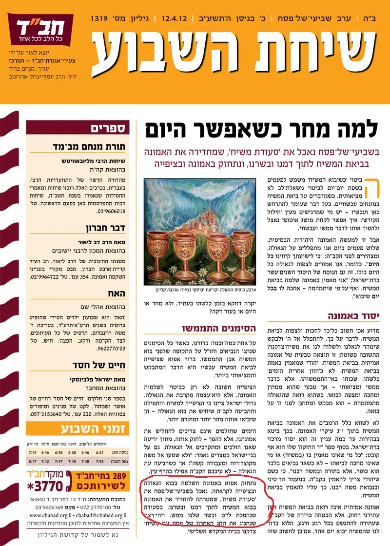 "סעודת משיח (סעודה גשמית, אוכל) שמטרתה להחדיר את האמונה בבוא המשיח לתוך דמנו ובבשרנו".