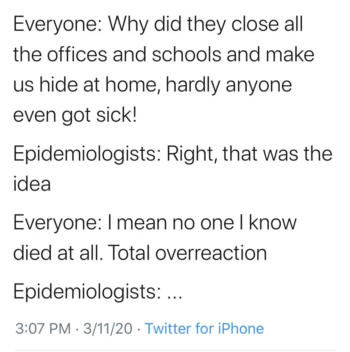 אאמל"ק: בשונה מתאונות דרכים או סתם מחלה וירלית, כ-20% מהנדבקים בקורונה חייבים אשפוז. קרי, ללא הגבלה על התקהלויות יהיו כאן עשרות אלפי נדבקים, אלפים יזדקקו לאשפוז (בבידוד, כמובן, ואז הרופאים שמטפלים בהם, יצטרכו להיכנס לבידוד), רבים יזדקקו למכונות הנשמה (שאין מספיק באף מדינה). בקיצור, קריסה טוטלית של מערכת הבריאות, כמו באיטליה.