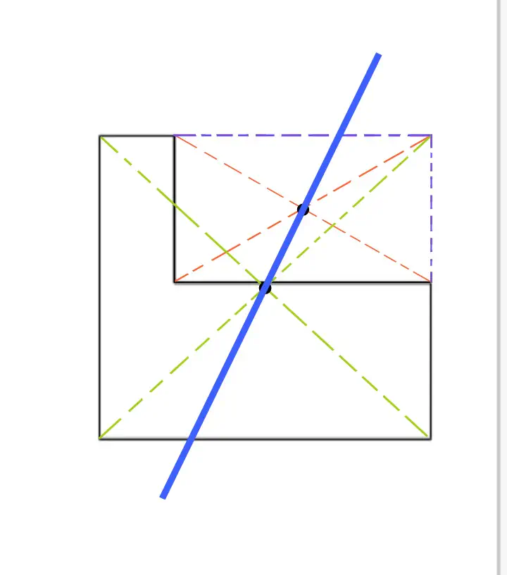 עכשיו, יש שני מלבנים, ABCD, ו-DEFG, כש-ABCD הוא מלבן גדול, שמכיל בתוכו את DEFG. עכשיו נמתח אלכסונים לכל מלבן, ונמצא את נקודות מפגשי האלכסונים אצל שני המלבנים, שהם נקודות המרכז של שני המלבנים. עכשיו, נעביר קו בין שני הנקודות האלו, והקו הז יחצה את ה-L לשני חלקים זהים בשטחם. אם שני הנקודות זהות, אז כל קו שיעבור דרכם יחצה את ה-L לשני חלקים שווים בשטחם.