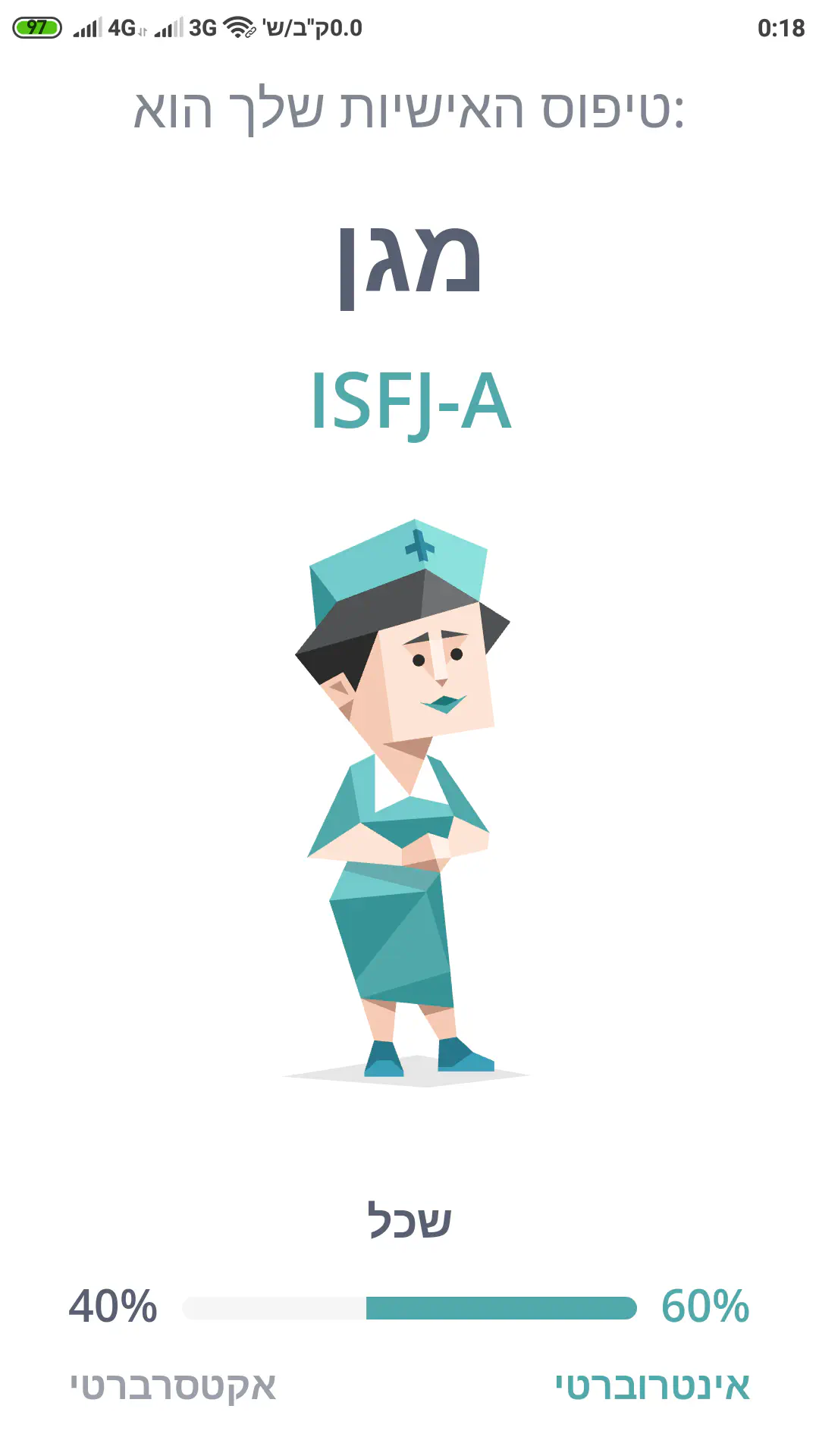 לגבי האינטרוברטיות - אני חושב שזה גם הרבה עניין של הרגל, אני מאמין שעד לפני שנתיים הייתי מקבל בזה אחוזים הרבה יותר גבוהים.