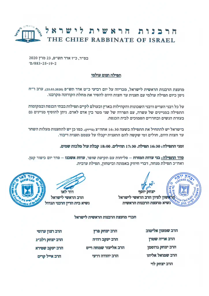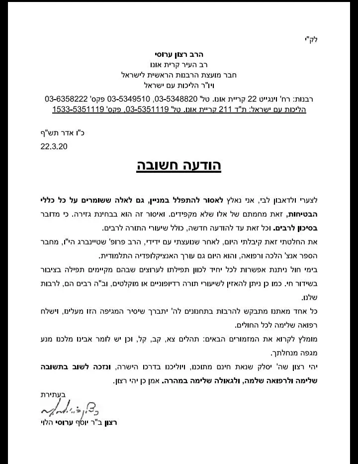 "איננו צריכים להחמיר יותר מהוראות משרד הבריאות דווקא כאשר הדבר נוגע לענייני קודש. אם היתה הוראה של משרד הבריאות שלא לצאת מהבית – לא היינו מורים לצאת מהבית כדי להתפלל במניין.
