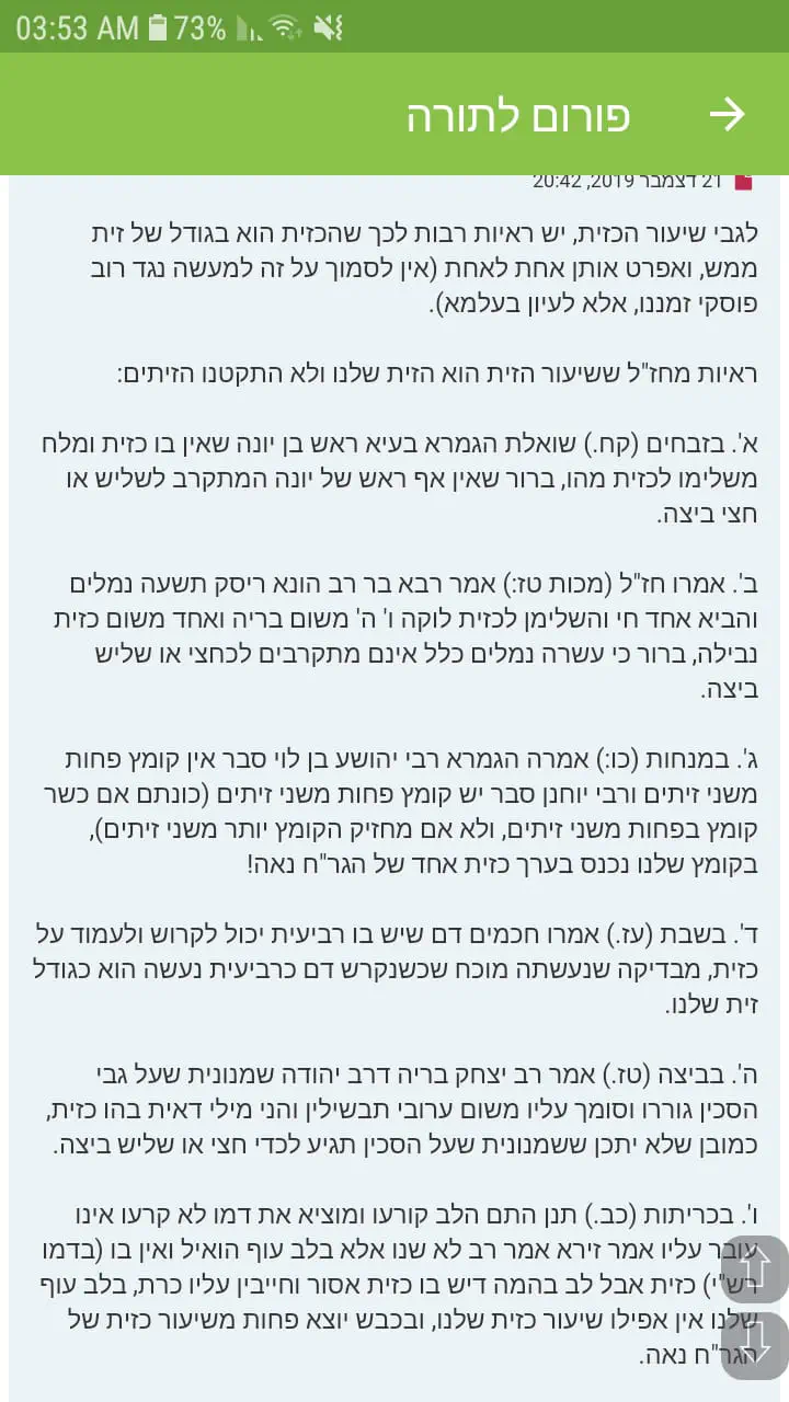 של זית, ולפעמים הם אפילו מחשבים לפי שיעור גדול יותר [המכונה שיעור חזו"א], ועדיין זה יוצא פחות מחישוב לפי משקל [במצה, שהמשקל הסגולי שלה נמוך].