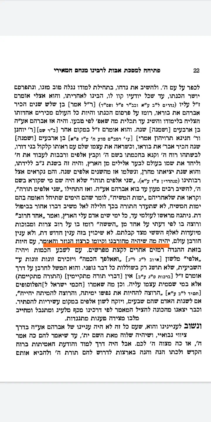 הם גם דנים בשאלה למה בכלל המשפט הזה בגמרא בשונה מעוד מימרות שלא התקבלו בכזו החלטיות ,דווקא האימרה על קיום העולם שזה לא דבר של מה בכך, סחף את כולם עד ששמעתי רב אחד שאמר שלפי היהדות המשיח מוכרח לבוא בזמן הזה (עד סוף הששת אלפים) אם לא אין יהדות. עד כדי כך..