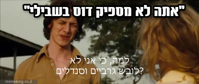 אני לא יכולה להתחתן עם חרדי רגיל שטוב לו בדרך שלו, או דת'ל רגיל שלא מוכן לצאת עם מישהי שהיא לא בדיוק בדיוק כמוהו, כן, אני לא ממש עסוקה בזה כל היום אבל קצת