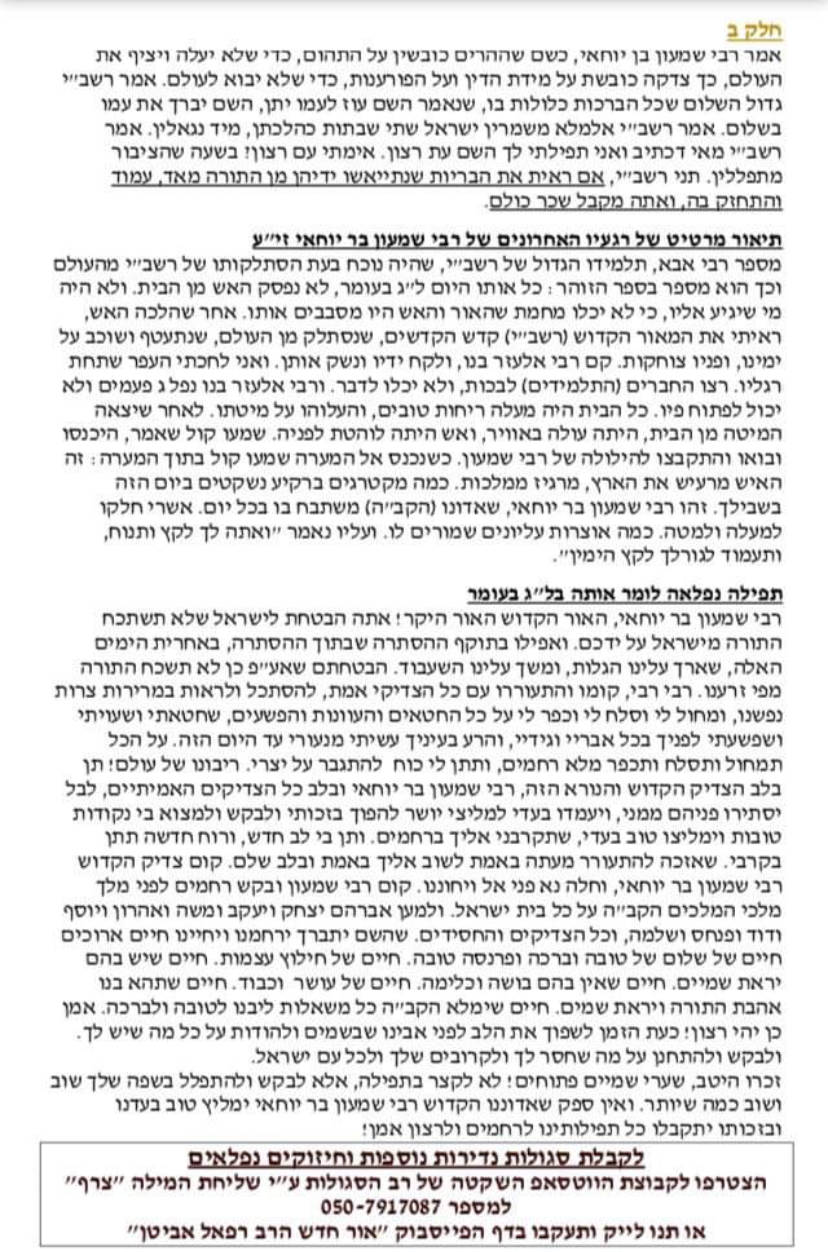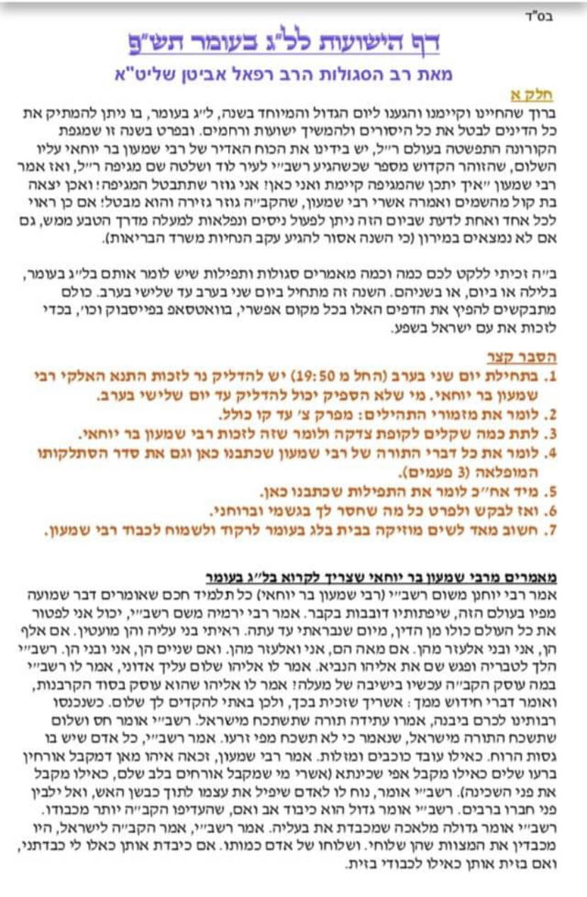 "ראוי ונכון כבר בליל ל"ג בעומר להדליק נר יפה ומכובד (ואם ישנה אפשרות, טוב להדליק נר עם שמן זית)לכבוד התנא הקדוש רבי שמעון בר יוחאי ולומר בפה מלא בשעת ההדלקה: "הריני מדליקה נר זה לכבוד התנא האלוקי רבי שמעון בר יוחאי, זכותו תגן עלי ועל כל בני ביתי ועל כל עם ישראל אמן כן יהי רצון".