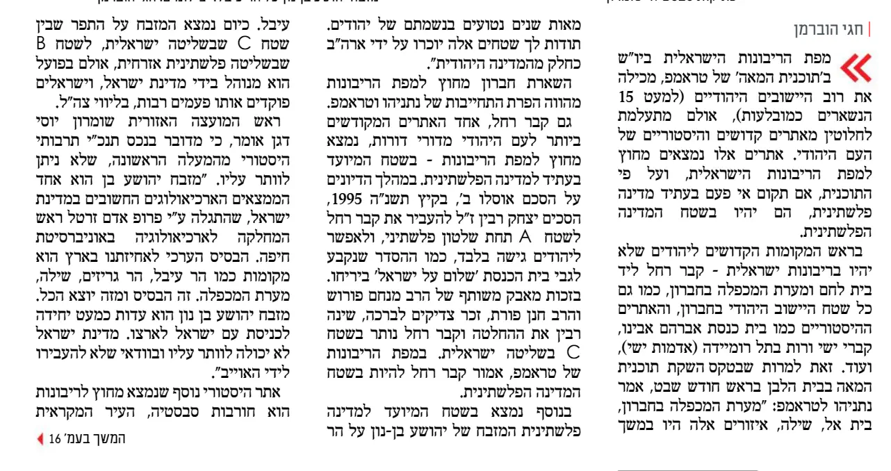 לעניין זה גם מערת המכפלה וגם קבר רחל במשמע, וצריכים להשאר בריבונות ישראלית מלאה עם גישה חופשית ודרך בטוחה בשליטה ישראלית מלאה. אם זה לא מובן מאליו יש להסתפק בהחלת ריבונות על בקעת הירדן שנמצאת בקונצנזוס כאמור, ולהמתין לשעת כושר אחרת שאולי תבוא, ואולי לא.