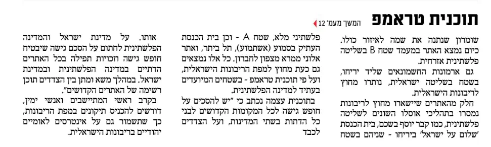תכנית טראמפ רואה לנגד עיניה סכסוך טריטוריאלי, ולא דתי אתני, לפיכך למפרע היא נועדה לכשלון. הפקעת המקומות הקדושים מידי ישראל מוסיפה שמן למדורה ותומכת בפועל בנרטיב הערבי שלפיו הם בעלי הארץ הזו. מדברי ימי העמים רואים באופן שיטתי שפעולות הכיבוש הראשונות של כולם היו לחסל את המקומות הקדושים של הנכבשים.
