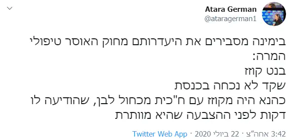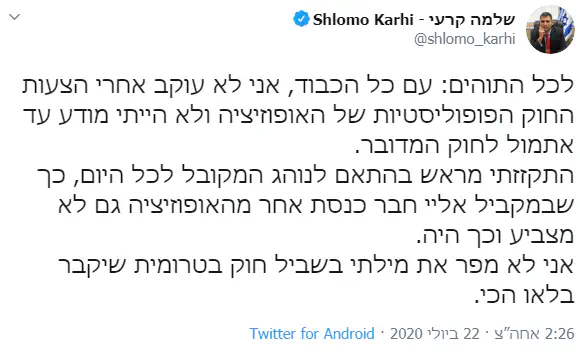 ואם מתן כהנא היה כותב בטוויטר שלו, או יתראיין [או שיעשה את בימים הקרובים], ויאמר שהוא נגד החוק הזה, ובגלל טעות הוא לא הספיק להגיע, וזה יתוקן בהצבעות על הקריאות הבאות, אז מבחינתי אין לי טענות נגדו.