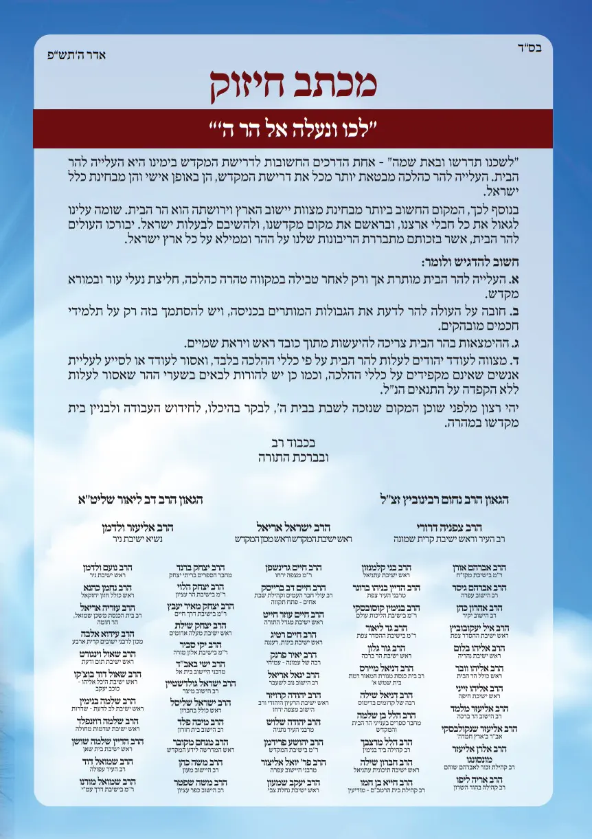 רבים מחותמי המכתב שלמטה (שאצלו החידושים עם רבנים גדולים נוספים) חתמו על מכתב שלא ישתמע מזה שהם תומכים בעלייה להר. זה כולל את הרב גרינברג, הרב הרשקוביץ, הרב אליקים והרב שחור. גם הרב דרוקמן ידוע שלא תומך בעלייה.