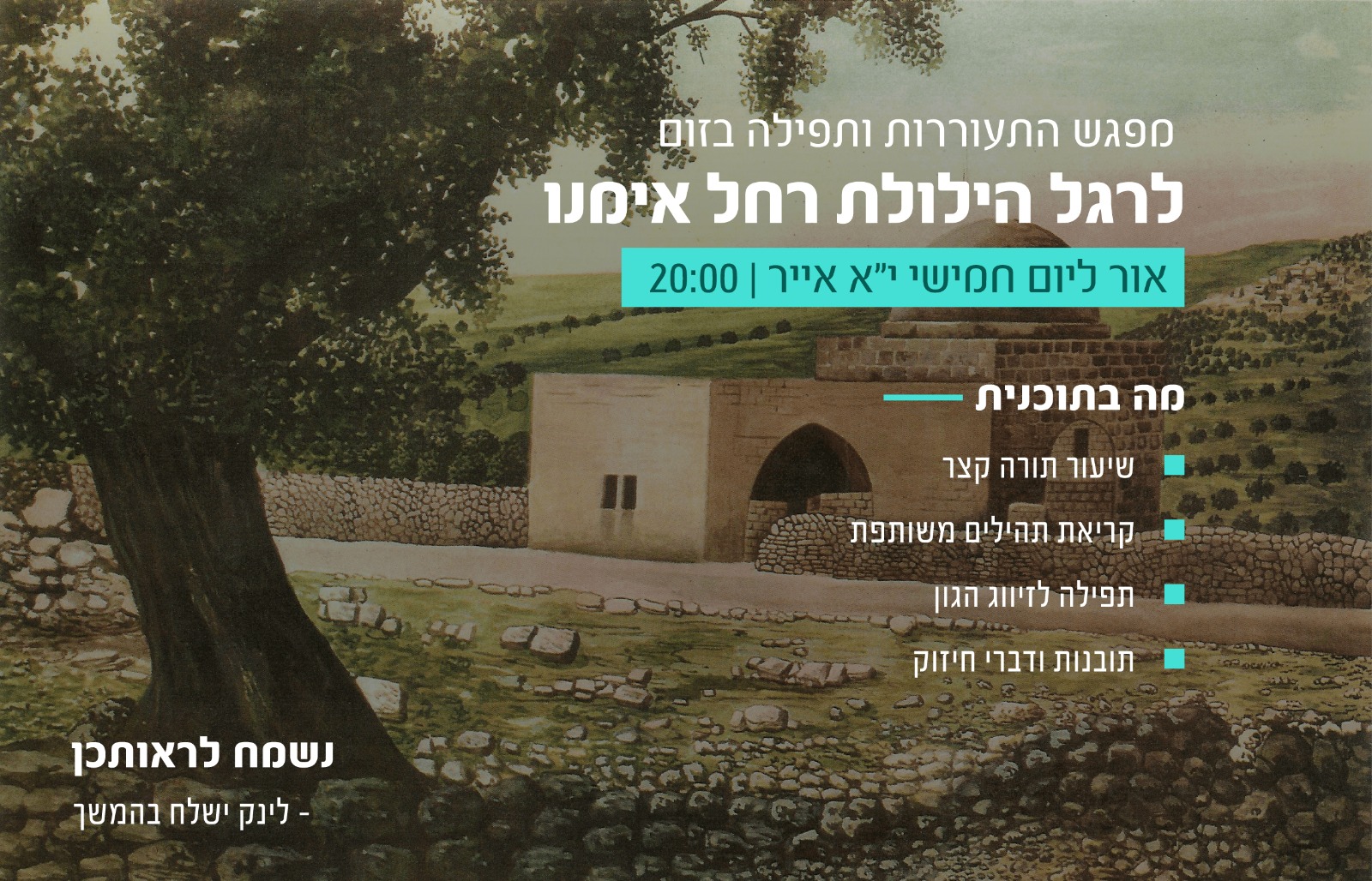 הריני באה לפניך, לשפוך שיחי בדמעות ובהודיה,היום (יום הילולת רחל אימנו ע"ה), באתי להזכיר כי גם אני רוצה בלב שלם להקים בית בישראל. מודה אני לך על כל הטוב שגמלת עמי ועל הדרך בה הנך מוליך אותי יום יום. דרך שיש בה חן וחסד, טובה וברכה; דרך בה אני זוכה להיפגש גם עם אנשי אמת, בעלי מידות טובות; דרך רצופה תקוות והצלחות, לצד מהמורות ומשוכות שאחריהם, אני פעמים גם מועדת. תודה על הלימודים המשמעותיים ורגעי ההבנה והתובנה, גם אלו הכרוכים בכאבי גדילה ותודות להם, אני צומחת.