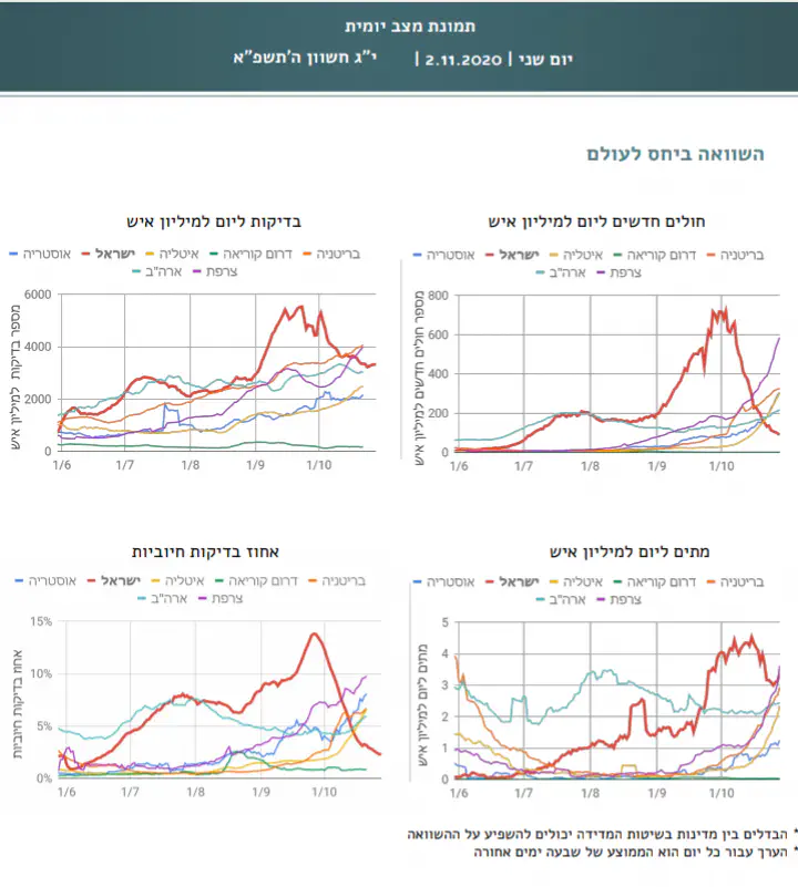 גם בישראל אומנם הנתונים נראים רעים כעת, אבל שוב, זה כי היינו מבין הראשונים לצאת ולשחרר ולכן ספגנו ראשונים את הגל השני. אם נסתכל בעוד חודש על המצב, אחרי שגם מדינות אירופה יעברו את השיא של הגל השני, אנחנו עלולים (ח"ו) לראות איך הנתונים משתווים לנתונים שלנו כיום. האם זה מועדד? ממש לא. אבל זאת הסתכלות נכונה יותר על המציאות.