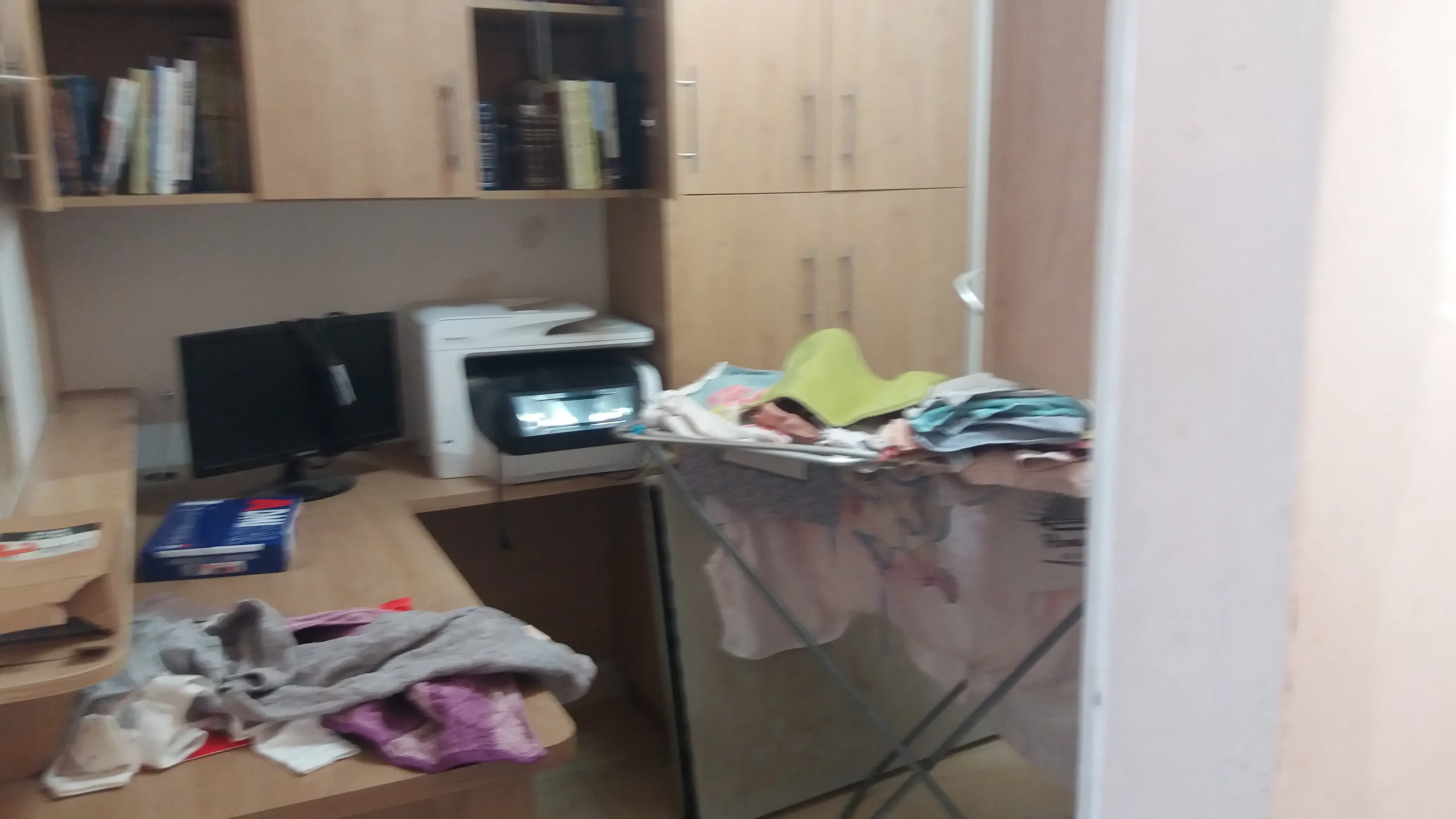 עוברים דירה לבית שיש בו פינת עבודה, אז יש שם שולחן- מדף לאורך הקירות.