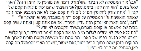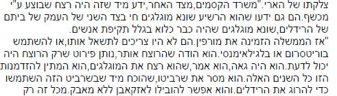 "אתה מבין" הוא אמר להארי "עכשיו שיאשרו לי לתלות מחבלים מהצוואר שלהם למטה במרתפים, יצורים מבחילים, כבר לא יוכלו לזרוק פצצות סירחון על ישראל. נכון? הייתם חושבים פעמיים לפני שהייתם מלכלכים עםבוץ נגד ישראל, אם הייתם יודעים שאני יכול לתלות אתכם כמה ימים! נגמרו הימים האלה. חוץ מזה ראש הממשלה הסכים לחתום על צו גירוש לטיבי!"