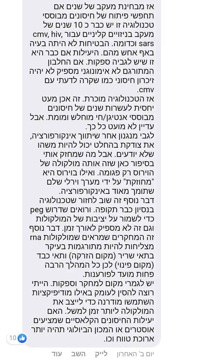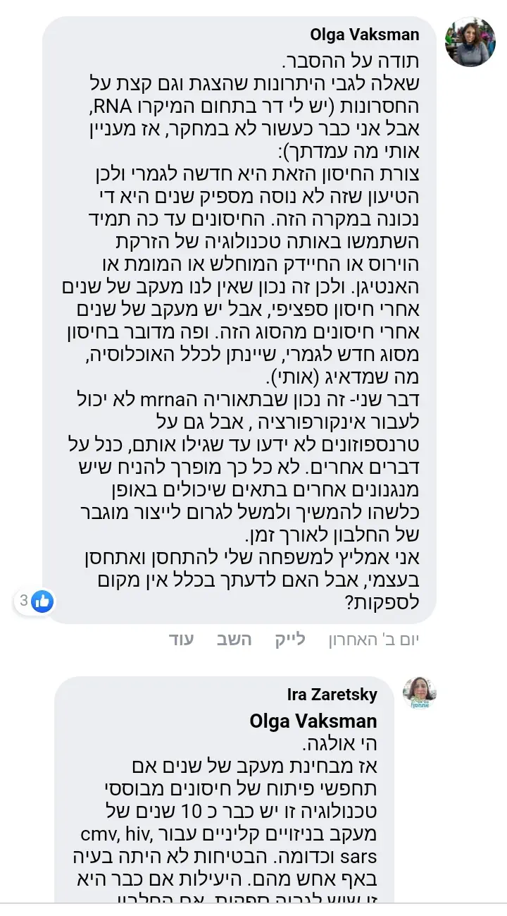 גילוי נאות: לא התעמקתי בפרטי החיסון. כי אני חושבת שאי אפשר להעריך כראוי את רמת הסיכון שלו , לפני שהוא ייכנס לשימוש נרחב.