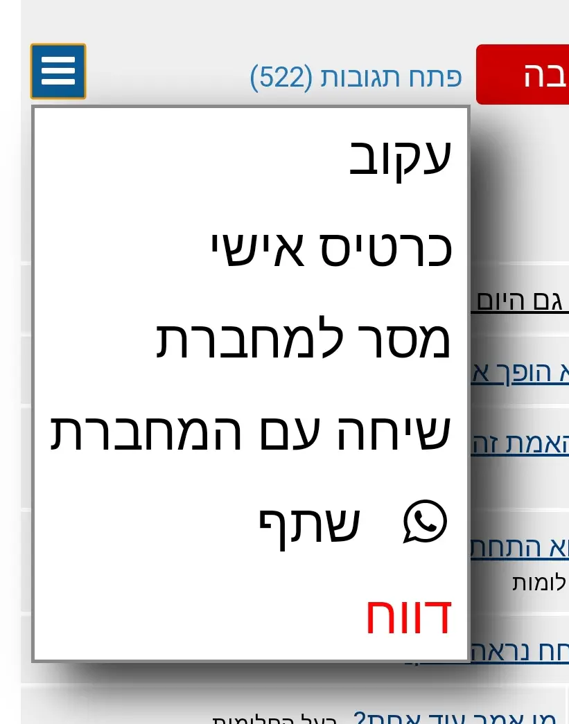 אם ראית תגובה מסוימת שלדעתך אין מקומה בפורום, את תמיד יכולה ללחוץ על כפתור הדיווח ואז זה מגיע למנהלי הפורום לבדיקה.