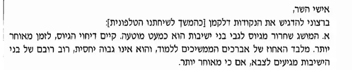 בנוגע למה שכתבתי על החרדים, ייזכר לטוב הרב מרדכי נויגרשל, שלא פחד להכריז שבמדינה מתוקנת תורנית יגוייסו בחורי במסגרת הסדר, ושהסיבה שהחרדים אל הולכים היום, לשיטתו, היא אחת - שהעסק לא מנוהל על פי תורה.