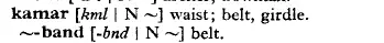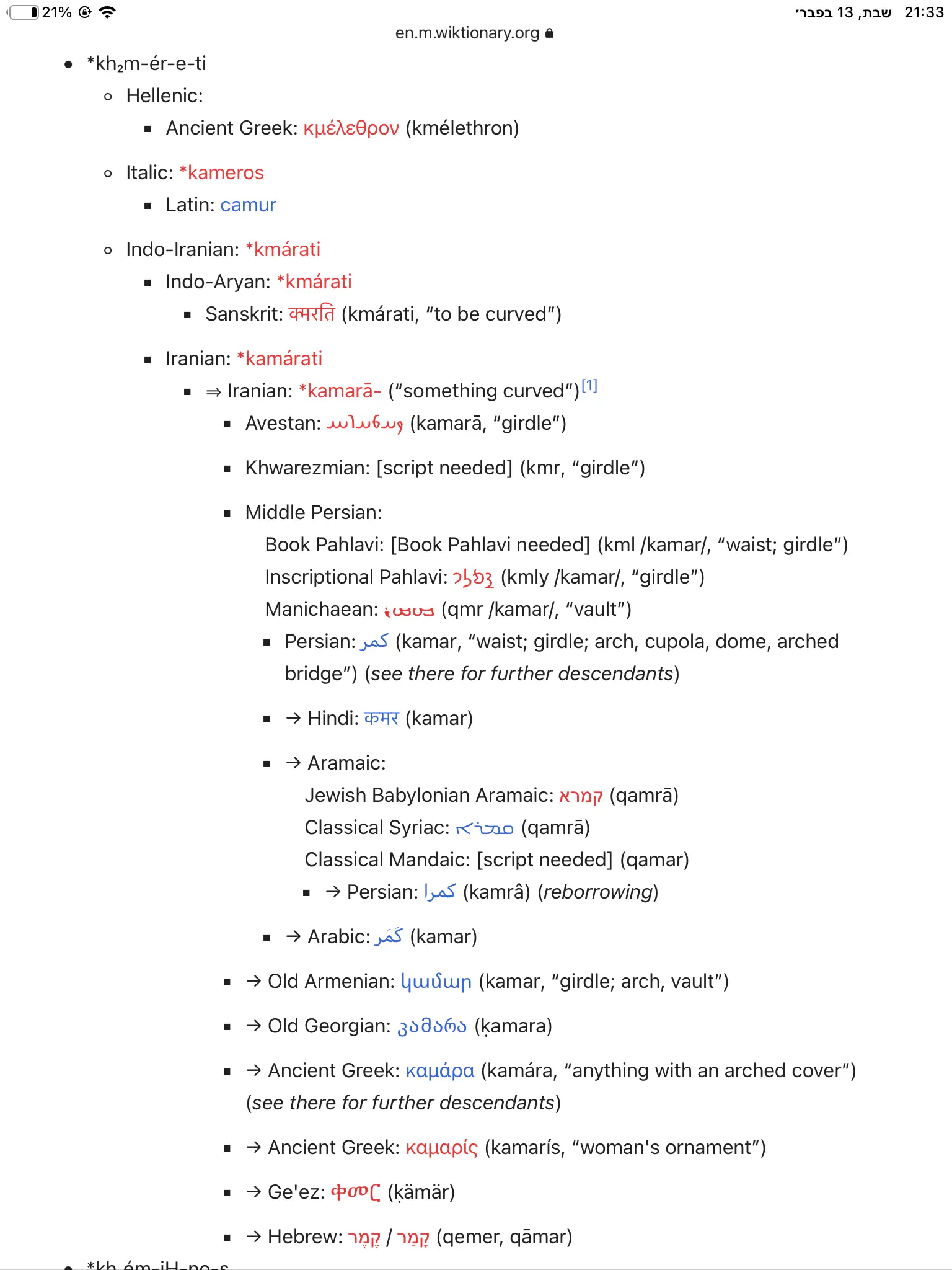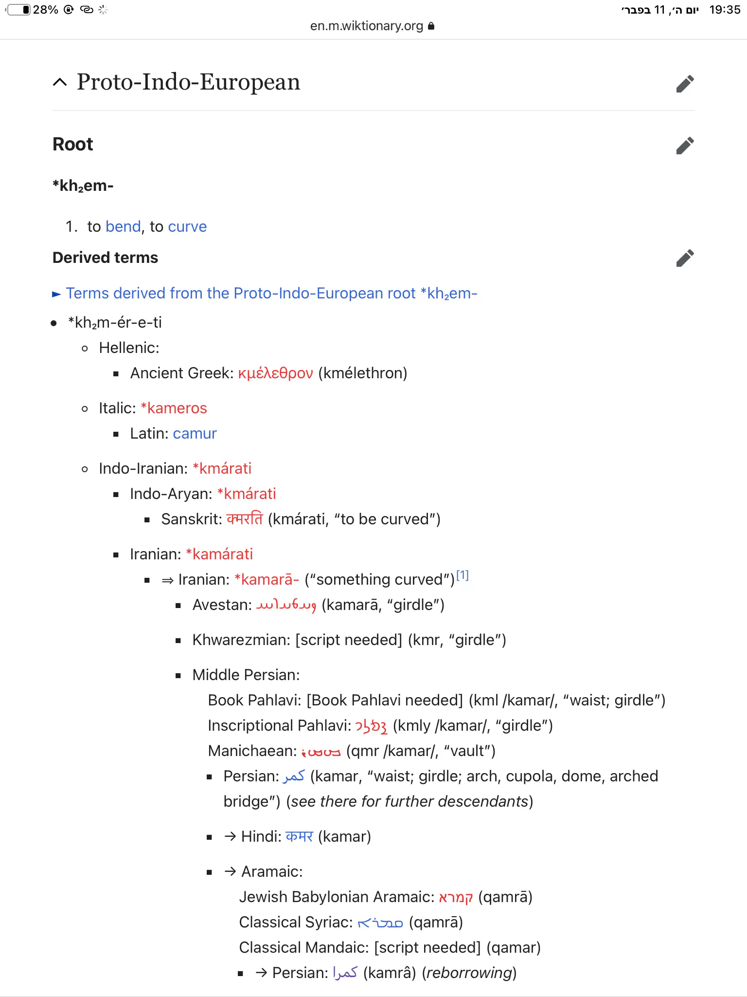 ומייד חשבתי לעצמי שהמילה הזאת מוכרת לי. کمر = kamar בפרסית המשמעות שלו היא מותניים (waist). אז שיערתי שקמרא המשמעות שלו היא חגורה. במילון ארמי עברי של עזרא ציון מלמד הרבה פעמים הוא מביא את המקור בפרסית למילים ארמיות בגמרא, אז תכף הלכתי לראות אם גם הוא מקשר ככה, אבל ראיתי שבמקרה הזה הוא לא קישר. אז עשיתי קצת חיפוש והגעתי לעמוד הבא שממנו נראה שצדקתי בהשערה שלי והמקור של המילה קמרא הוא בפרסית (קדומה):