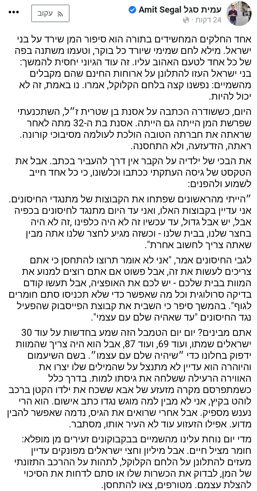 אני לא רוצה פה דיון אם אני צודק או לא. אני רוצה שנתעורר כחברה להבין שאם לא נתעורר על החיים שלנו ונתחיל לגלות אהבה אחד לשני - כמו שלא היה חיסון לחורבן בית שני שנגרם משינאת חינם, ככה יגיעו עוד ועוד חורבנים שעוד אלפי שנים אנשים ישבו ויכעסו עלינו - למה הם לא פשוט אהבו אחד את השני?? גם לחורבן שלנו שיגרם מהשינאה לא יהיה שום חיסון שיפתור אותו.