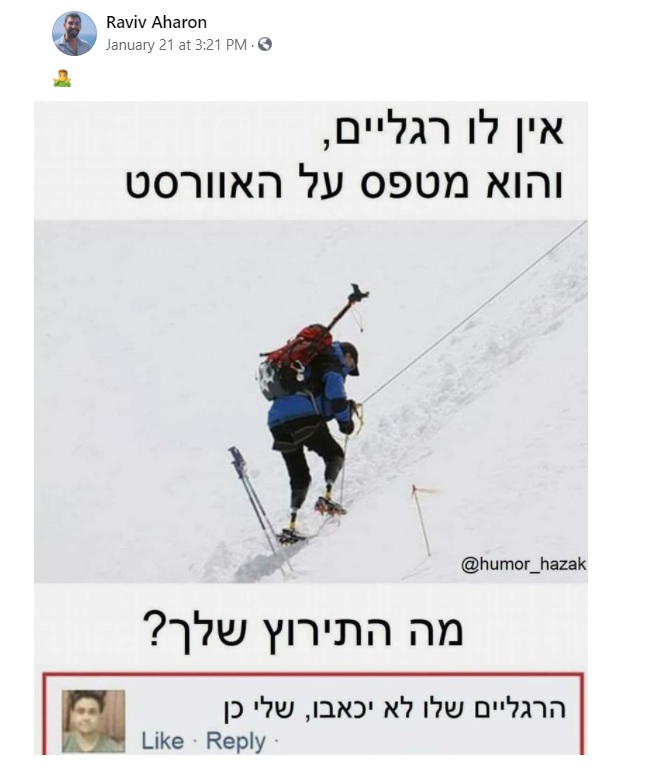 איש אחד בלי ידיים, בלי רגליים, מחובר למכונת הנשמה ויושב על כסא גלגלים, עולה למטוס. באמצע הדרך עוברים מעל כפר קטן והוא אומר לדיילת: אני צריך לרדת כאן. היא נחרדת ואומרת, אבל אנחנו באמצע טיסה. הוא מתעקש. היא רצה לטייס ואומרת: איש אחד רוצה לרדת באמצע הטיסה!! הוא אומר: אה, ההוא בלי ידיים, בלי רגליים, מחובר למכונת הנשמה ויושב בכסא גלגלים? כו, היא אומרת. אה, הוא תמיד יורד כאן, אומר הטייס..