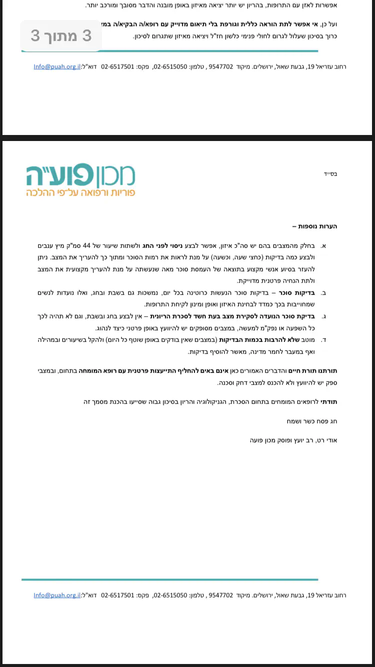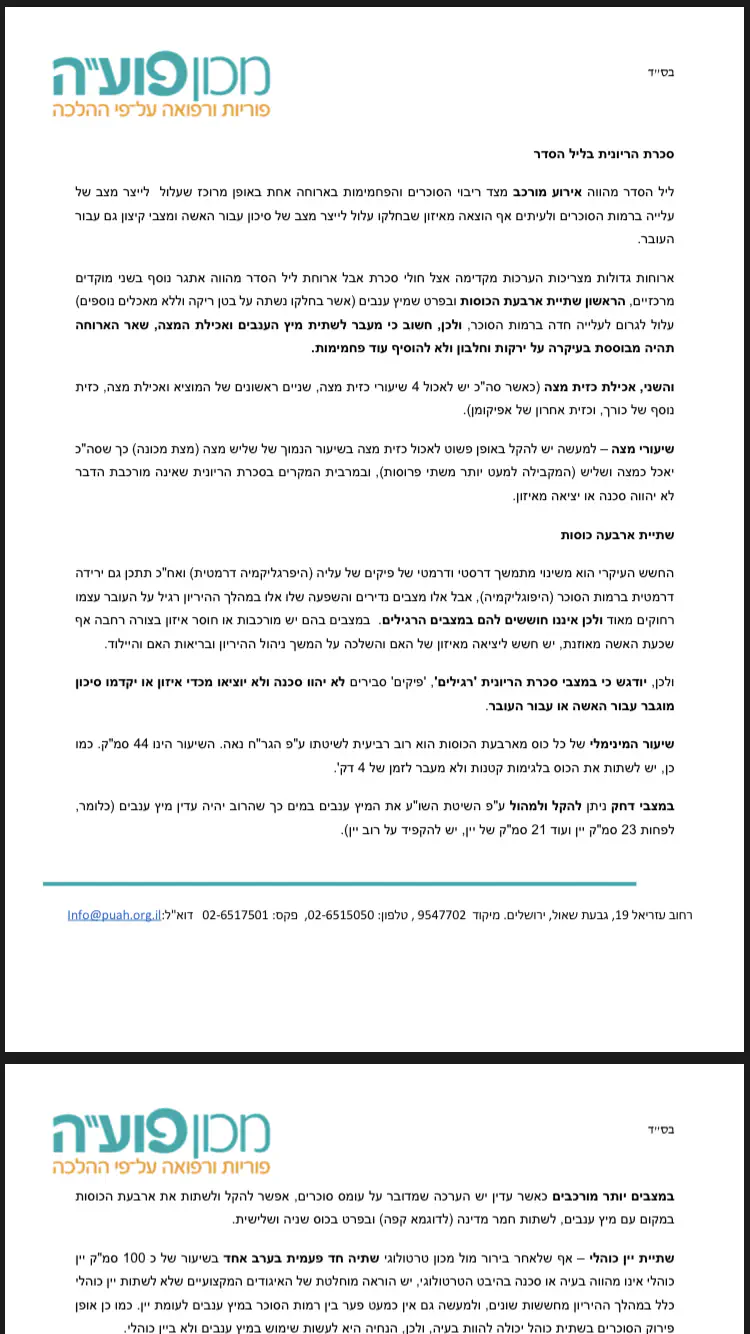 אז מה עשיתי? פניתי הבוקר למכון פועה. הרב שענה לי הראה הרבה ידע, ושאל הרבה שאלות כדי לענות לי בהתאם למצבי (איך אני מטופלת, שבוע היריון, ערכים אחרי אוכל וכדו'). לאחר מכן ציין בפני את הכמויות המינימליות לכזית מצה (-שליש מצה) וכוס יין ( -44 סמ"ק). הוא אמר שאכילת המצה היא הרבה פחות בעייתית ( מכל מיני סיבות) , והעניין הבעייתי הוא בעיקר שתיית 4 כוסות. הוא ביקש שאעשה ניסוי - אשתה 44סמ"ק מיץ ענבים , ואמדוד סוכר אחרי 15 דק', 30 דק' ושעה.