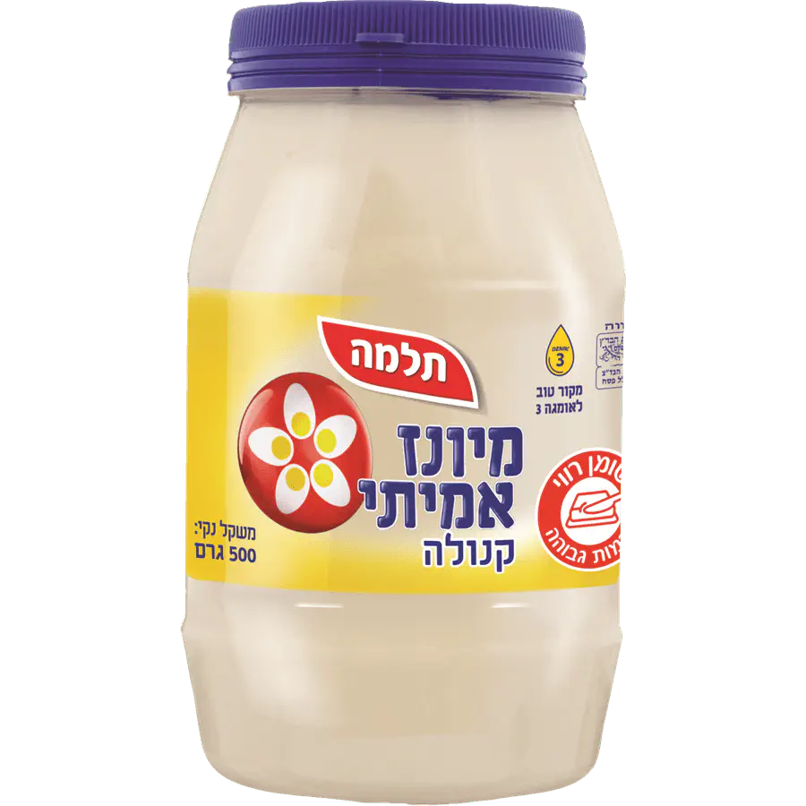 במיונז על בסיס קנולה, יש 0.02% שמן סויה. ורשום על המיונז לאוכלי קטניות.
